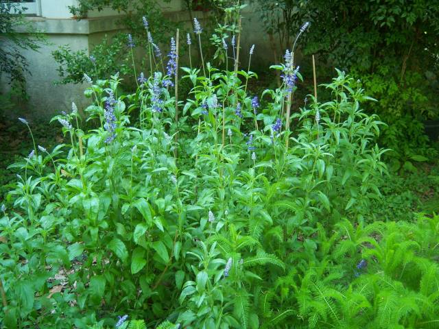 I bought seeds of the Salvia farinacea ‘Blue Bedder’ from the Dollar General store in Leland, Mississippi in the spring of 2010 or 2011. I transplanted the seedlings in the corner bed next to the den at the mansion when they were big enough.