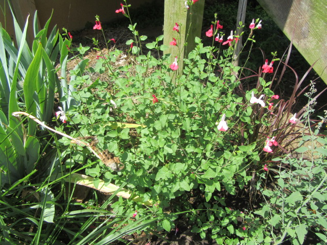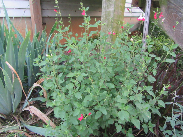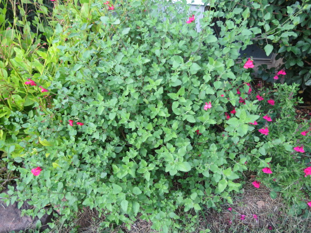 You can see how much bigger the Salvia microphylla ‘Hot Lips’ is compared to the Salvia greggii ‘Furman’s Red’ to the right. Of course, the Crape Myrtle next to it didn’t help it much.