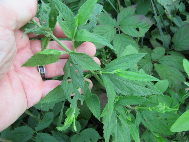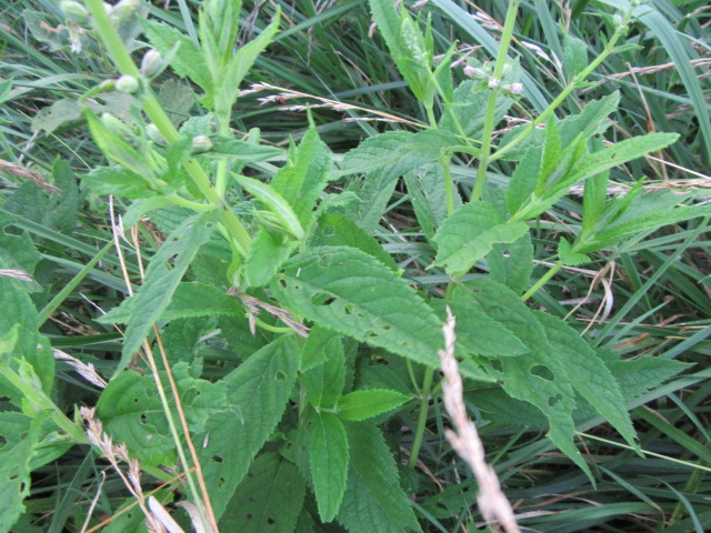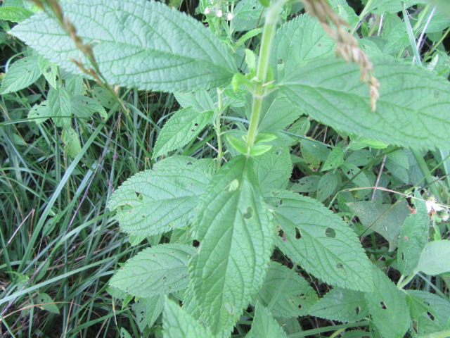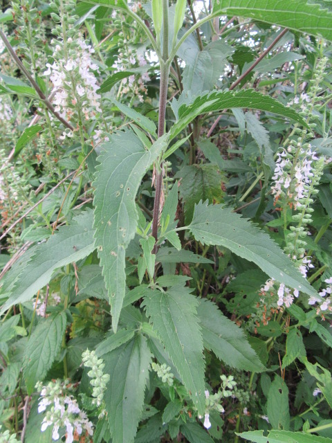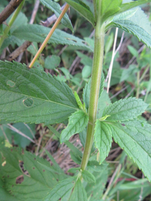 The leaves grow in pairs in an opposite manner along the stems. They are up to 5” long and 2 1/2” across, lanceolate to ovate, broadly lanceolate, oblong-lanceolate, and are finely to coarsely toothed. The tips are sharply pointed while the bases are angled or more rounded. The lower leaves have petioles (leaf stems) that are approximately 1/2” long while the upper leaves are sessile (no petioles). The pairs of leaves are decussate, which means they are rotated 90° from one pair to the next. At most leaf nodes, another pair of leaves emerge from the axils of the petioles of the older leaf. The upper (adaxial) surface of the leaves are dark green, have short-appressed hairs, and recessed veins. The under surface (abaxial) has short curved or longer, straight wooly hairs and is a lighter green.