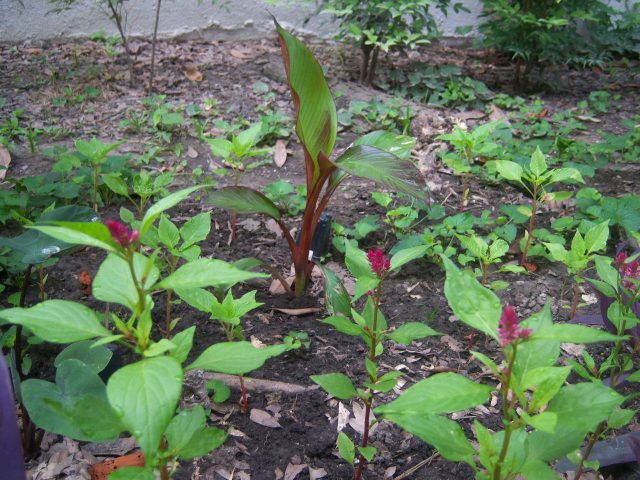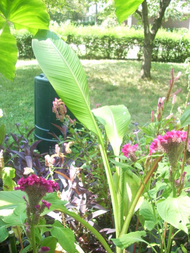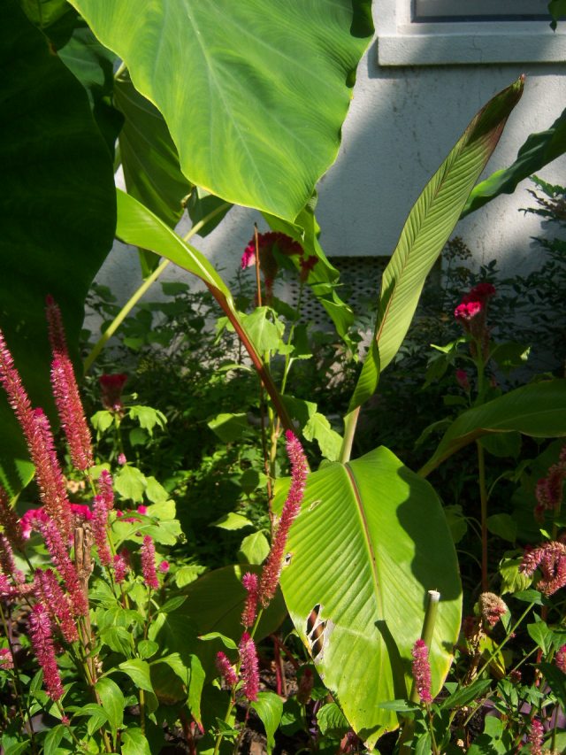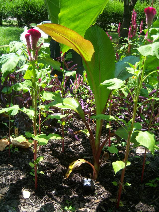 Ensete ventricosum ‘Maurelii’, Celosia argentea ‘Punky Red’ and Celosia argentea ‘Heirloom Giant Burgundy’ almost hidden by the Elephant Ears on 8-4-1, #113-5.