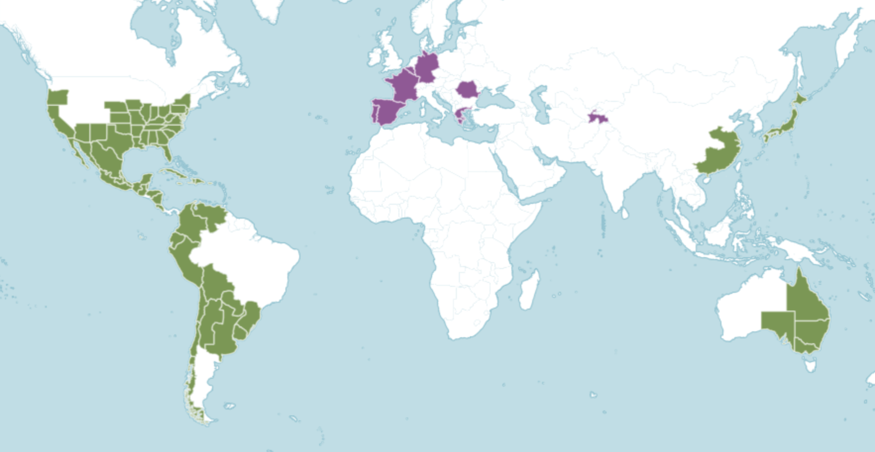 The distribution map for Ludwigia peploides is from Plants of the World Online. Areas in green are where the species is native and purple is where it has been introduced. You can view their map for Ludwigia peploides subsp. glabrescens HERE. The maps on the USDA Plants Database are basically the same.