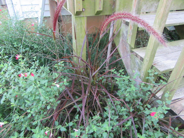 The Purple Fountain Grass makes an excellent addition to flower beds but is best placed where they can be seen. I say that because I put a Salvia microphylla ‘Hot Lips’ in this bed which nearly hid the Purple Fountain Grass.