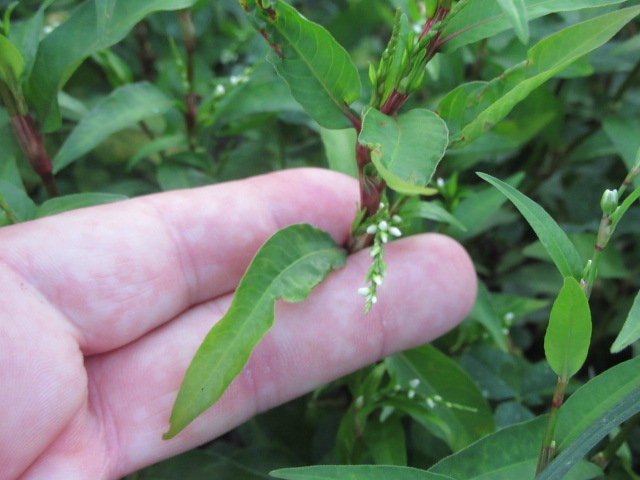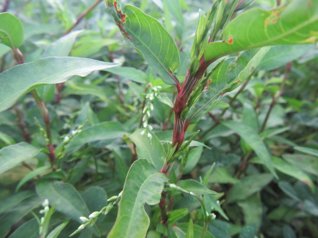 Their alternate leaves have short petioles, sort of olive green in color, lanceolate to linear, and are around 3 1/2″ long x 3/4″ wide, smooth, and normally hairless. So, if you see a colony of white-flowered Persicaria and some of the leaves are 4″ or longer, they are likely not P. hydropiper and more likely to be P. punctata.