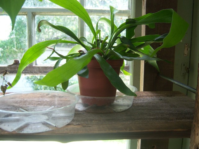 I kept my Staghorn and Elkhorn Ferns on a cypress shelf I made in the kitchen at the mansion. It received good morning sun in that location and did very well. My first one was in the butler’s pantry where it received a little sun in the afternoon. That didn’t work so well. Some information suggests wrapping the rootball with sphagnum moss and attaching it to a board. Although that would have been pretty neat, I just left mine in a pot. After a while, I transferred it to a larger pot and added plenty of organic stuff. It seemed fine with it and started growing very well.