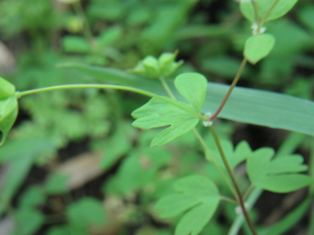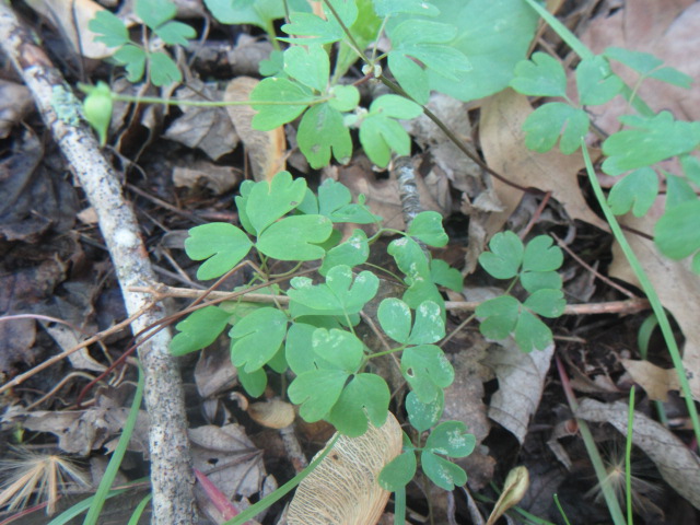 Its leaves grow in an alternate manner, are ternately divided or trifoliate, and glabrous (hairless). The basal leaves have longer petioles (stems) than the upper leaves. Leaflets are broadly lanceolate to ovate, 2-3 lobed or parted, and sometimes have shallow notches at the tips. Information says leaves are 2-3 times compound and 3 parted…