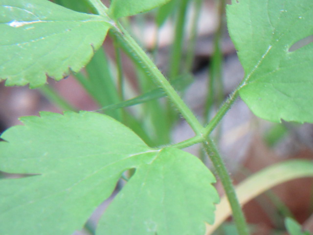 The leaves grow in an alternate pattern along the stems. Both basal (lower) and primary leaves are trifoliate (having three leaflets) and are said to be ovate, broadly-ovate, to nearly heart-shaped in outline. Basal and primary leaves have fairly long petioles while those of the upper leaves are shorter or sessile (no petioles). The leaflets also have three lobes (ternate), although the lowest leaves (the earliest) may just be deeply lobed. The center leaflet has a fairly short petiolule (leaf stem) while the two on the side are usually sessile (no petiole) or they have very short petiolules. The margins usually have rounded teeth (irregularly dentate). The petioles and upper surface of the leaves (adaxial) are also pubescent (hairy) while the lower leaf (abaxial) surface is mostly hairy along the veins.