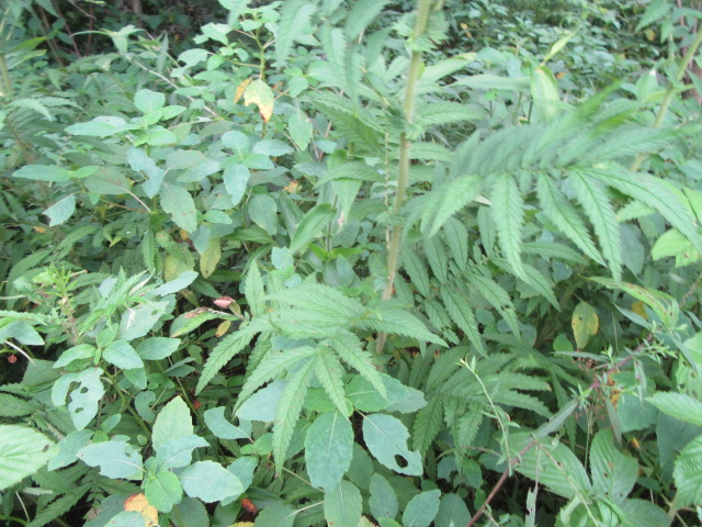 The pinnately compound leaf blades grow up to 24” long and 6” across and have 9-23 primary leaflets. Leaflets are said to be narrowly lanceolate, narrowly oblanceolate, or elliptic in shape with coarsely toothed margins. Between the primary leaflets are numerous smaller secondary leaflets. The upper surface (adaxial) is mostly smooth (glabrous), while the under surface (abaxial) is glandular and hairy (pubescent). The petioles and rachis of each compound leaf are hairy, sometimes longer hairs. There is also a pair of large stipules with pointed lobes.