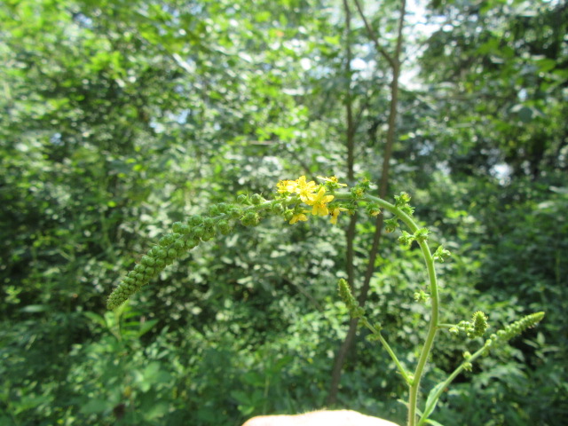 The racemes produce numerous bright yellow flowers on short stalks (pedicles). I think the flowers are surrounded by a calyx and a ribbed obconic hypanthium with hooked bristles toward the rim. I need to dissect a flower… Each flower is about 1/4” across and have 5 small sepals, 5 bright yellow petals, 5-10 stamens, and a pistol. The blooming period in my neck of the woods in west-central Missouri is from August through September.