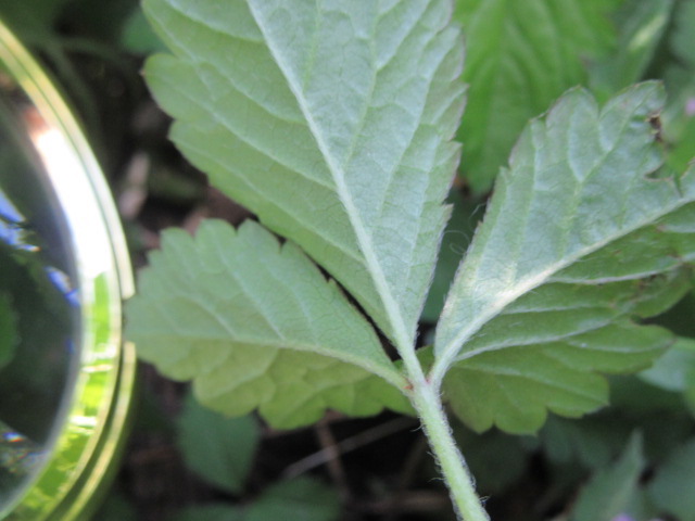 The crown produces rosettes of leaves on long petioles (leaf stems). The petioles have antrorse hairs that lay fairly flat. The trifoliate leaves are broadly ovate, the margins bluntly toothed (crenate) with forward-facing teeth (serrate). The leaves are somewhat hairy, especially on their veins, with antrorse hairs. There are stipules (small appendages) at the base of the leaf petioles.