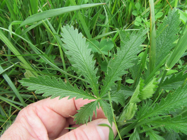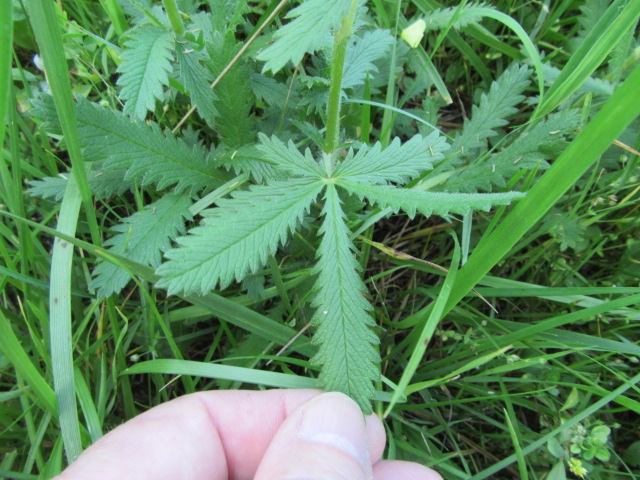 One of the distinguishing features of Potentilla recta is its leaves. They are palmately compound with the lower leaves having 5-7 leaflets, sometimes up to 9.