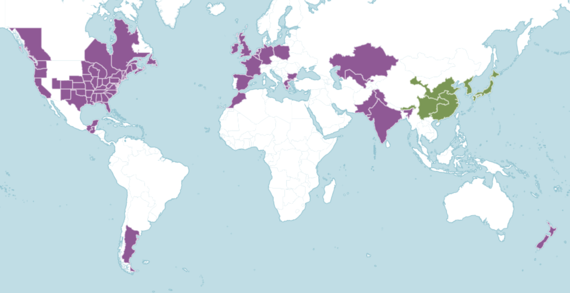 The above distribution map for Rosa multiflora is from Plants of the World Online. Areas in green are where the species is native and purple where it has been introduced. The map on the USDA Plants Database for North America is a little different.