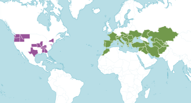 The above distribution map for Cruciata pedemontana is from Plants of the World Online. Areas in green are where the species is native and purple are where it has been introduced. The map on the USDA Plants Database is much different… POWO gets their maps from Flora of North America, but they don’t include the species YET. When they do, POWO will update their maps. I used this map mainly to show where the species is native.