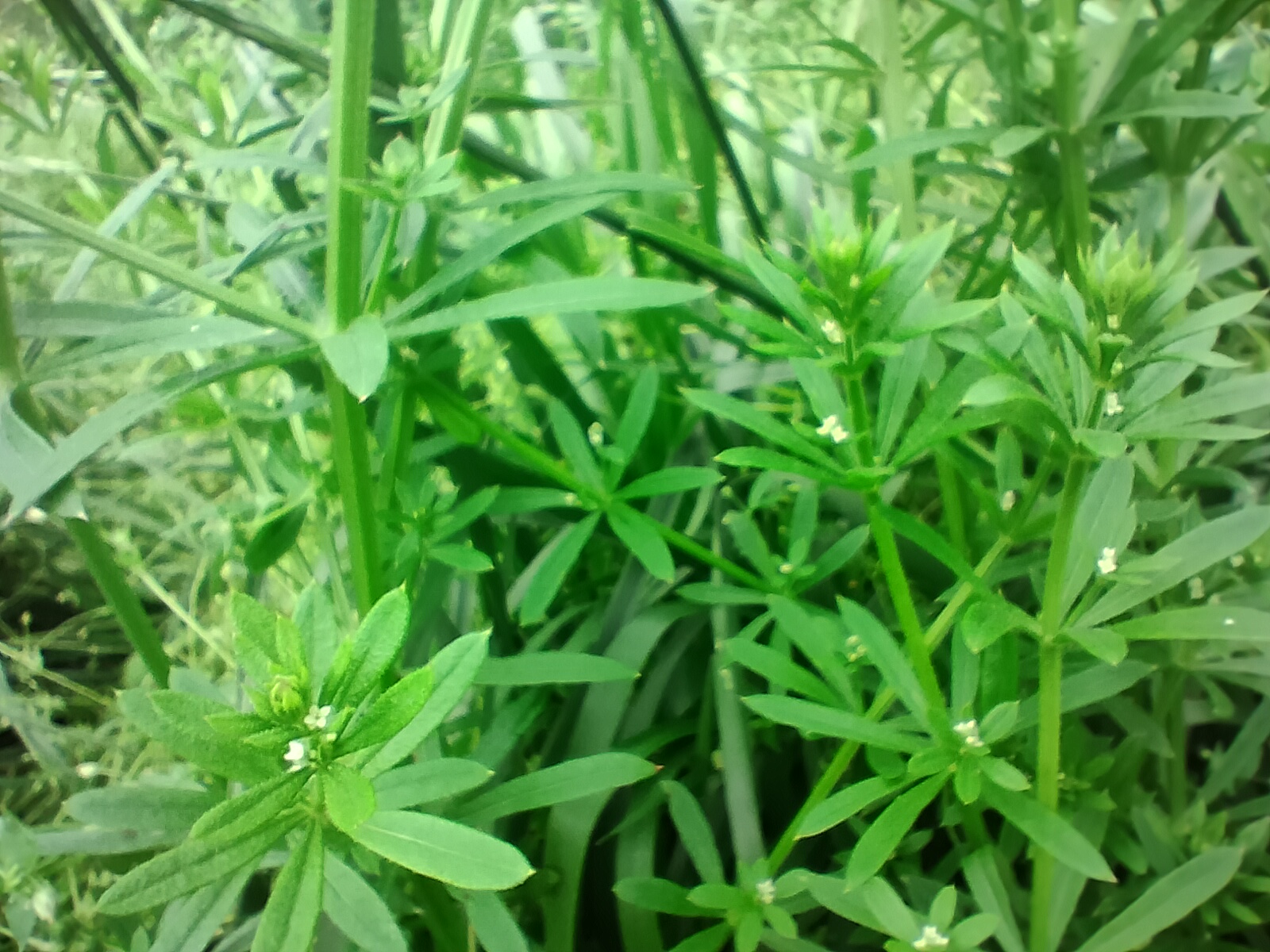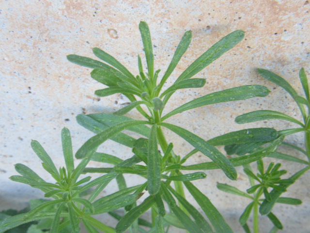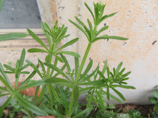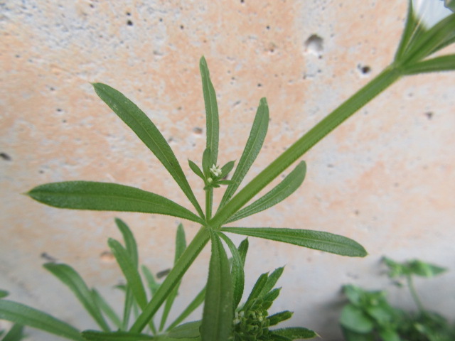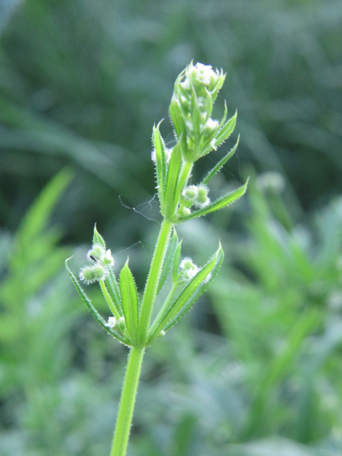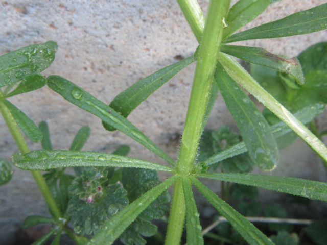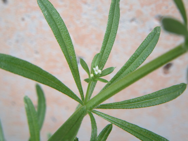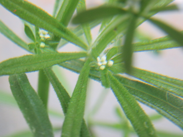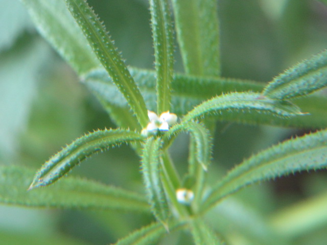 Up to eight narrow oblanceolate leaves grow in a whorled pattern along the stems. Of course, they also have retrorse hairs that are clingy.