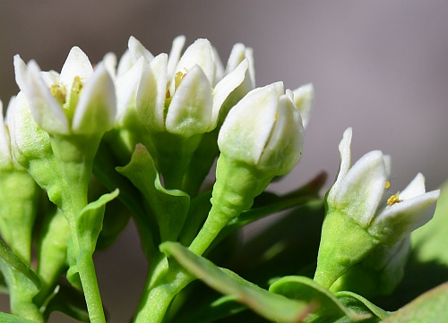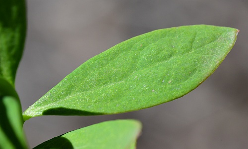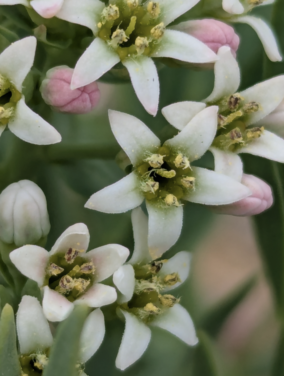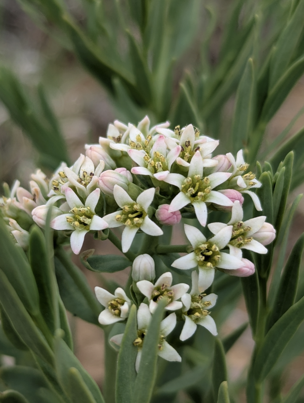 Their abundance of leaves grow in an alternate manner along the stems and are said to be oblanceolate, ovate, linear-elliptic oblong, etc. Take your pick… They taper to a narrowed pointed tip. The leaves are small, being only 1-2 inches long an about 3/4” wide. They are either sessile (no leaf stems/petioles) or have very short petioles. Both leaf surfaces are kind of a medium green. Some sources say the leaves are thick and fleshy, but I don’t remember that part. I need to go back again and check it out and take more photos…