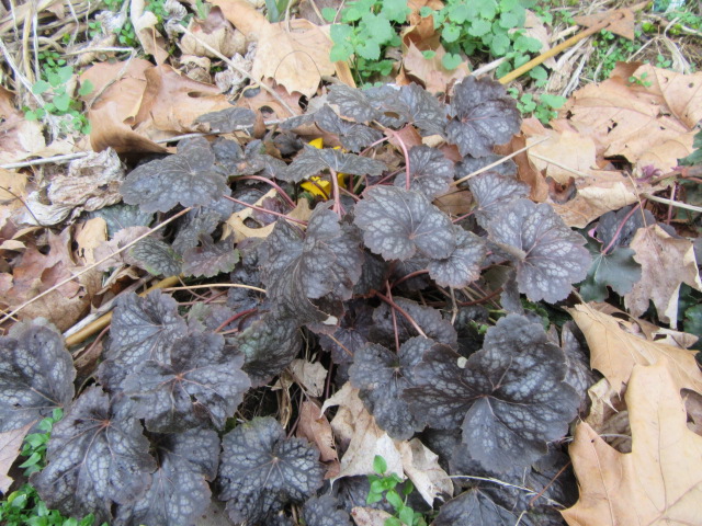 The Heuchera americana ‘Dale’s Strain’ made it through the winter with flying colors. Cold temps turn the leaves a different color.