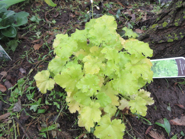 They have nice ruffled, chartreuse-green leaves that will brighten up your shade bed. This is my first Heuchera of this color.