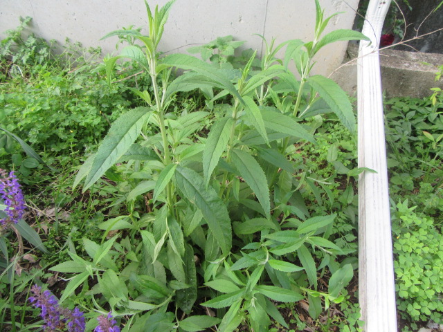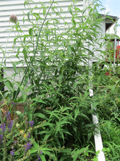 Buddleja davidii ‘White Profusion’ with buds on 6-14-15. The Salvia x sylvestris ‘Mainacht’ in the bottom left of the photo was bought from the same seller on Ebay in 2013. Always the first perennial to come up each spring. Photo #268-7.