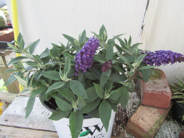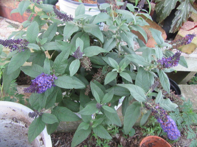As I mentioned, Buddlejas prefer full sun, but other information says full sun to part shade. I had the pot behind the shed throughout the summer with most of the other potted plants in light to part shade. It did just fine and flowered well all summer.