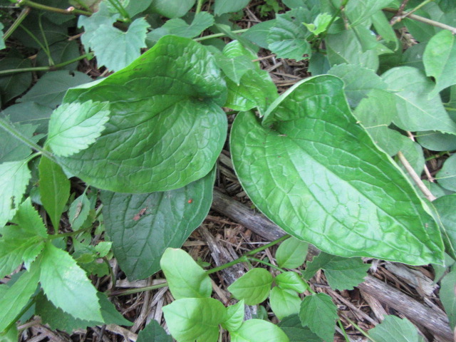 The leaves grow in an alternate pattern along the stems and grow to around 5” long and 4” across. The leaves are narrowly to broadly ovate, and glabrous (not hairy).
