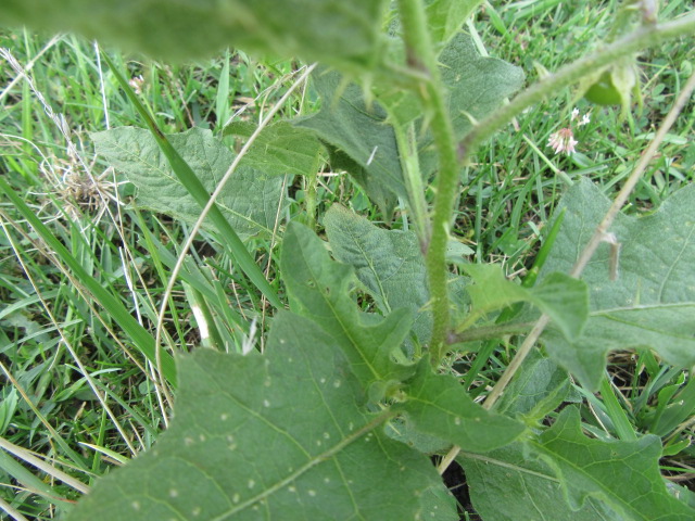 Horsenettle grows to around 12” tall on ascending to erect stems with multiple branches. The stems have small glandular, star-shaped (stellate) hairs along with scattered spines. They are a pain to pull up in the garden. I have learned they are less spiny toward the base.