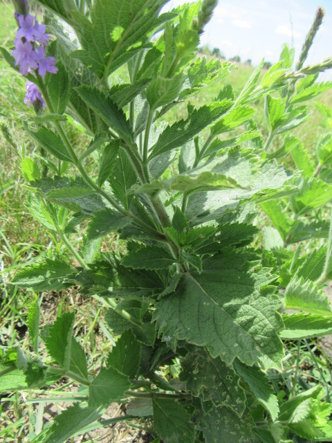Verbena stricta can grow to over 3’ tall from a taproot which may send up multiple stems and/or branch out at the top of the main stem. The plants I have found have had only one stem. The stems are square, green to reddish-purple, and fairly hairy. Plants normally branch out toward the top of the stem. This can vary somewhat in pastures as cattle can snip off the stems when plants are young. Experienced cattle (and deer) are not fond of Verbena species because they have a bitter taste