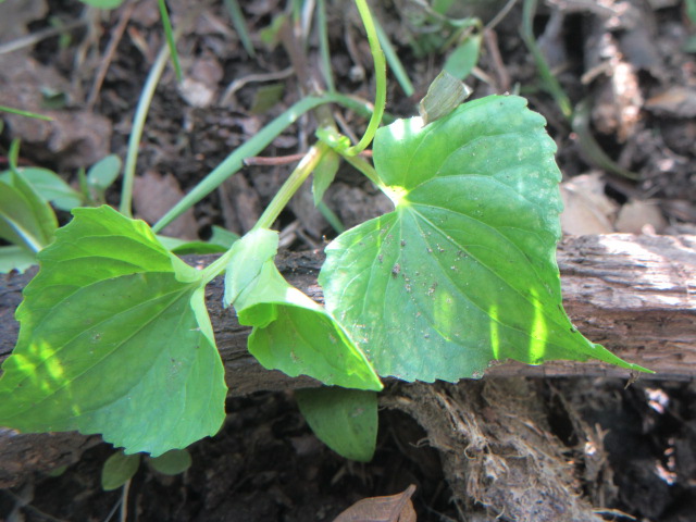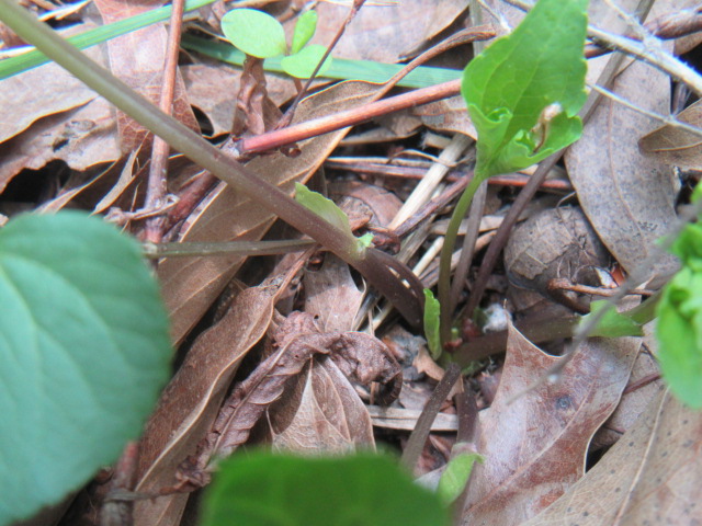 Viola pubescens and Viola eriocarpa are perennial wildflowers whose “stems” grow from an underground rhizome. Different violet species are either caulescent (having stems) or acaulescent (lacking stems). These two species are caulescent since they do produce stems. Typically, Viola pubescens produces a single stem while V. eriocarpa typically produces multiple stems per rhizome. The stems are short, maybe 1” or so, and are not that strong so they have a tendency to flop (ascending). Well, apparently, the stems of V. eriocarpa can be much longer.
