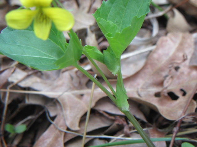 Cauline leaves grow in an alternate fashion along the stems are smaller in size with shorter petioles. The basal and cauline leaves are heart-shaped (cordate) and have blunt to pointed teeth along the margins. There are stipules that emerge at the base of the cauline leaves which is an interesting feature common to all the violets I have observed.