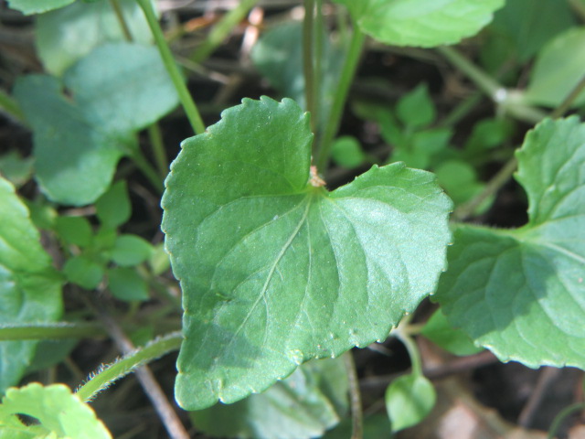 The heart-shaped (cordate) leaves emerge directly from underground rhizomes (acaulescent) on long stems (petioles). The petioles can be hairless (glabrous) or have fine, white, spreading hairs (pubescent). The leaves are usually as wide as they are long, but some can be longer than wide, or visa versa. The margins have can have fine to coarse teeth or be scalloped. Leaf surfaces can be glabrous (hairless) but more commonly have fine white hairs on both surfaces. Leaf shape and hairiness can vary from one colony to another. Leaves grow to around 3” long x 3” wide. OH, there are stipules but I have to do some investigating because I haven’t noticed those. I thought stipules only grew at the base of petioles on caulescent violets… Hmmm…