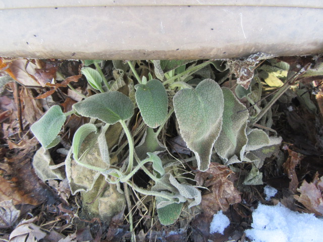 Of course, I had to look under the pot covering the Phlomis ‘Edward Bowles’. Hmmm… It didn’t even turn brown this winter. I covered it a while back because of paranoia. I am going to say it again… “I HOPE IT FLOWERS THIS YEAR.”