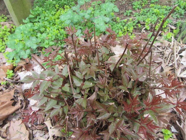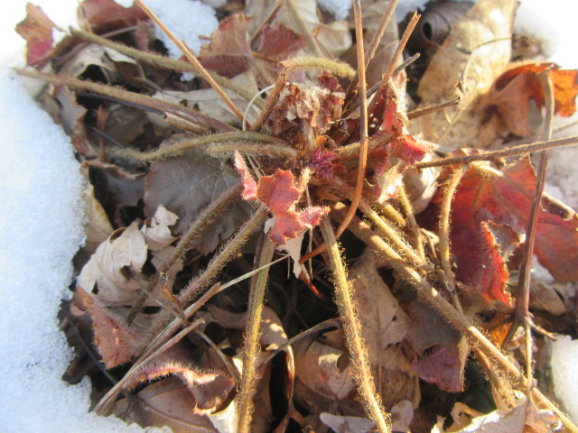 The Heuchera ‘Palace Purple’ is ready for spring. Its leaves are nearly as dark as ‘Obsidian’ during the summer and the plant and leaves get much larger.