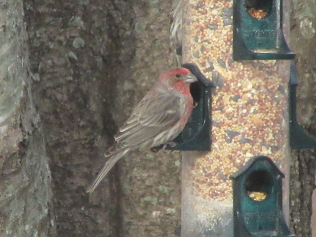 #2-Several House Finch (Haemorhous mexicanus) males were squabbling this morning but I finally got this good shot of one at the feeder. I noticed there were several extra-large female sparrows feeding then realized they were Purple Finch females. DUH!