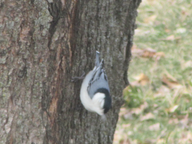 #4-The White-Breasted Nuthatch (Sitta carolinensis) was happily playing around on the tree most of the time. It seems to prefer seeds from the ground and the open feeder but on occasion will also go to the tube feeder. It seems like it prefers being upsidedown as well… Sometimes I have seen several of them fairly close together in the elm trees but only one (or one at a time) comes to feed. I have several good photos but this one is the best I could do this morning.