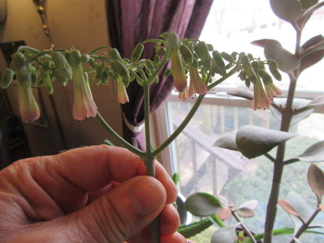 #6-The Kalanchoe x laetivirens (Mother of Thousands) flowers are now opening! This plant was in the back bedroom but the top of it was touching the shelf above it. A couple of days ago I looked at it and two of the buds had opened so I moved it to my bedroom. I have had this plant for several years and have whacked its stem in half many times to regrow it. If you don’t do this once a year the plant gets very leggy and its leaves are smaller. Cut the stem and the leaves grow HUGE.