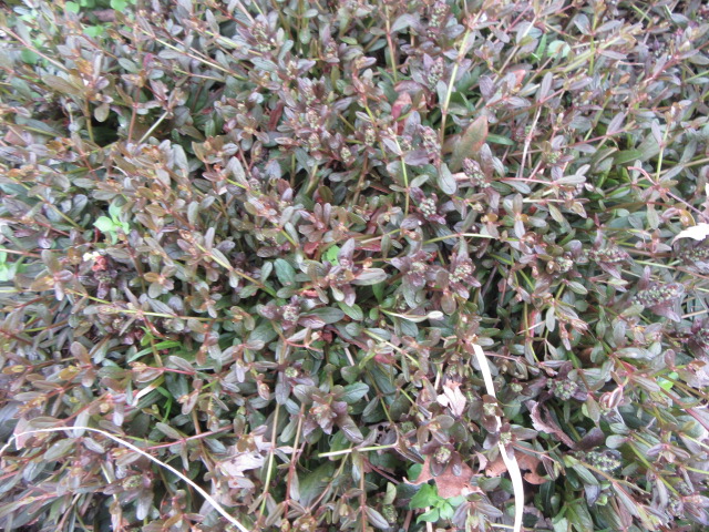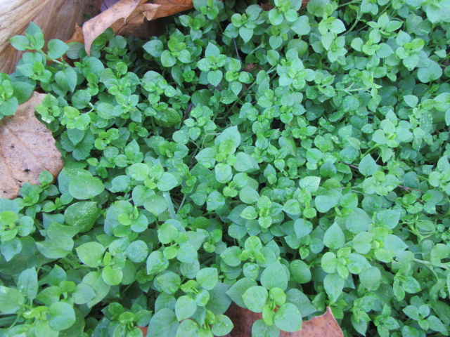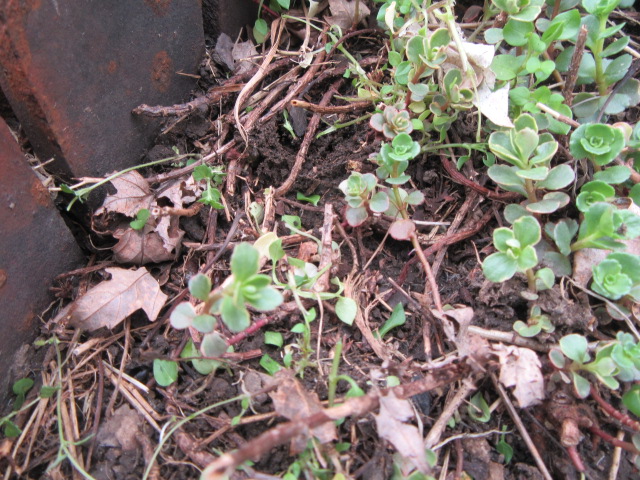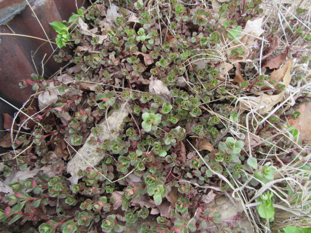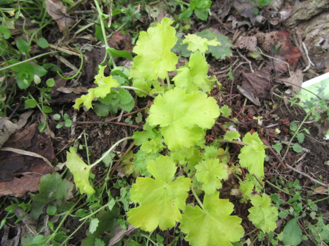 The Heuchera ‘Obsidian’ reportedly has the darkest leaves of the Heuchera cultivars but that depends a lot on the light. Oh, the Chickweed is also growing, which is definitely a sign of spring…