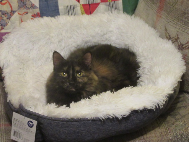 Little Bit was down at the barn but came up later when I filled the food pans. She was not interested in strangers at all. Then I took the piece of bamboo with yarn tied to it to try and get her to come in. While she did want the toy, she didn’t want to come into a house with strangers. She said, “the last stranger you took me to a few days ago ended up with me getting spayed.”