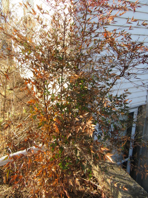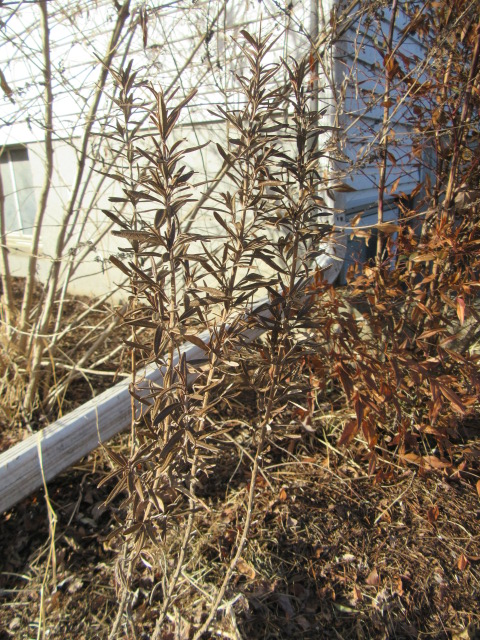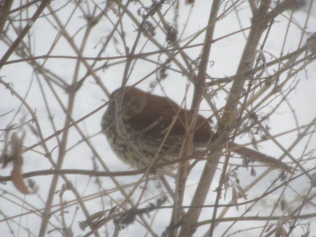 The Brown Thrasher resting in the Buddleja ‘White Profusion’ on January 16, 2016.