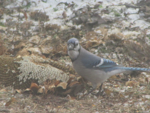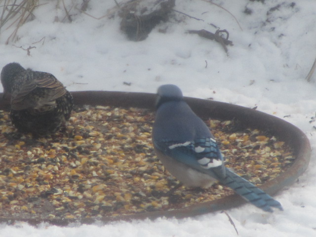 After we had a snow I put a lid from an old barrel next to the tree for the bird seed. The Blue Jay was the first to dig in.