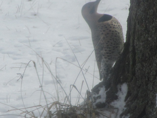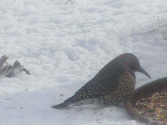 I don’t see the Flicker feeding on the south side of the house very often. They prefer eating ants and beetles as their main diet. They do like sunflower seeds, suet, cracked corn, peanuts, safflower seats and millet and they don’t mind eating from a feeder. Although they are a woodpecker, they prefer to find their food on the ground.