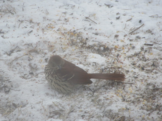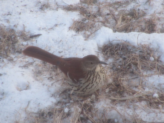She first appeared on January 15 from out of nowhere. She was trying to eat by the tree but a Blue Jay wouldn’t have any part of her so now she eats by the bedroom window. At first, I thought she was a Wood Thrush, but she had a much better disposition. The Brown Thrasher, according to research, is normally a summer resident of Missouri but this one decided to spend the winter