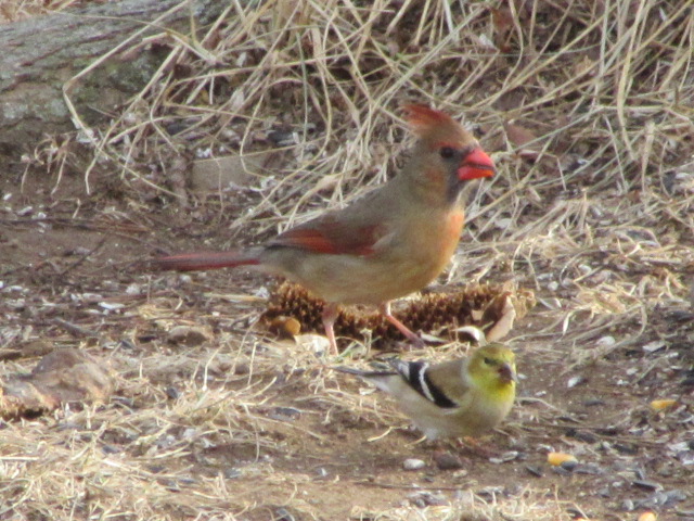 Northern Cardinal and American Goldfinch females on January 21, 2018.