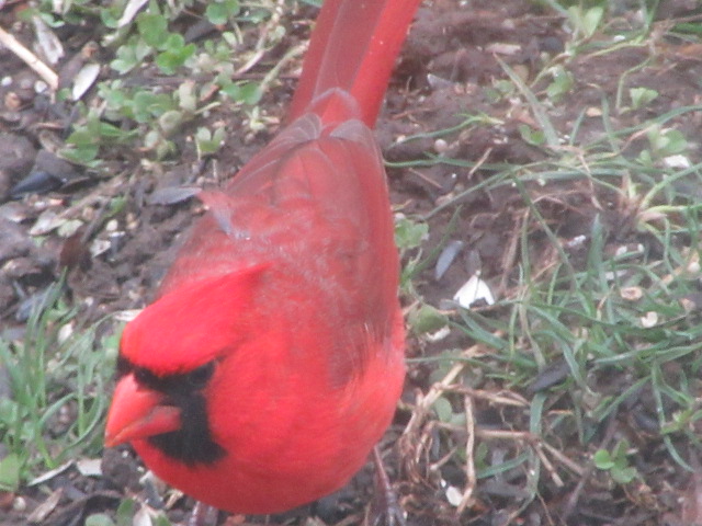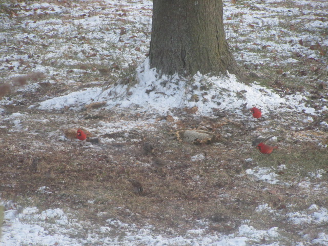 Normally, I don’t pay that much attention to birds. I just put their feed in the feeder and that’s about it. But this winter has been weird for me… I went from feeding maybe 100 pounds of mixed grain (or scratch) during the past winters to 40 pounds or more of wild bird seed every week since mid-December. The feeder in the “other yard” doesn’t always need to be filled every day unless the deer eat it during the night. I also take 1 gallon every day and scatter it in front of the flower bed next to my window and under the tree. Dad and I take turns buying the birdseed so it won’t cost him so much (or me either). Almost every morning he will tell me the birds are waiting for me or ask if I fed them.