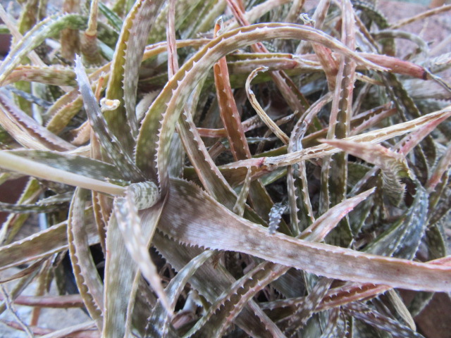 In 2009 I was plant shopping in a Wal-Mart store in Greenville, Mississippi and I saw a piece of a plant on the shelf. I looked around and found a similar potted plant labeled Aloe squarrosa. In 2012 I brought home another similar plant labeled Aloe zanzibarica (Zanzibar Aloe). When I was doing research for the blog I found out there was no scientific name for Aloe zanzibarica and my Aloe squarrosa was actually an Aloe juvenna. In fact, both plants were Aloe juvenna. I gave up those two plants but found the one I have now from Wagler’s Greenhouse in 2017. I think I may have given her this plant in the first place. Anyway, Aloe juvenna are easy to grow and pretty carefree. They are happiest when you leave the colony all together in a pot. You can propagate this one from offsets as well as stem cuttings although it may take them a while to root… Normally, this plant is nice and green if you don’t give it too much sun but for some reason, it started looking a bit off last winter…