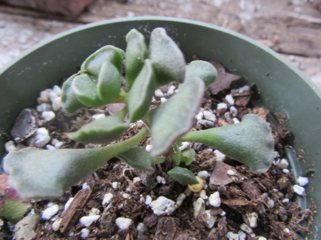 Hmmm… That’s all I can say about the Adromischus cristatus (Key Lime Pie). I brought this plant home from Lowe’s on April 23, 2017 and it has been weird. Of course, it looked much better when I brought it home, in fact, it was a very cute plant… It went downhill over the first winter and I thought surely it would die. It didn’t die but it didn’t do much of anything else either. It survived the summer AGAIN so I brought it back in the house for the winter. I guess as long as it wants to live I will support its cause… I have repotted it and provided what it supposedly needs but it doesn’t do anything but survive… Maybe I should talk to it more… 🙂