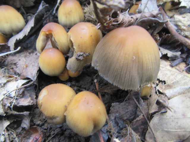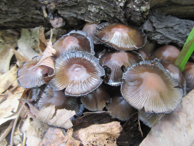 This cute little fungus with no pronunciation on Dave’s Garden is called Coprinellus micaceus. This species prefers growing on or near rotted wood and even grows underground. Common names include Mica Cap, Shiny Cap, and Glistening Inky Cap. Wikipedia says: