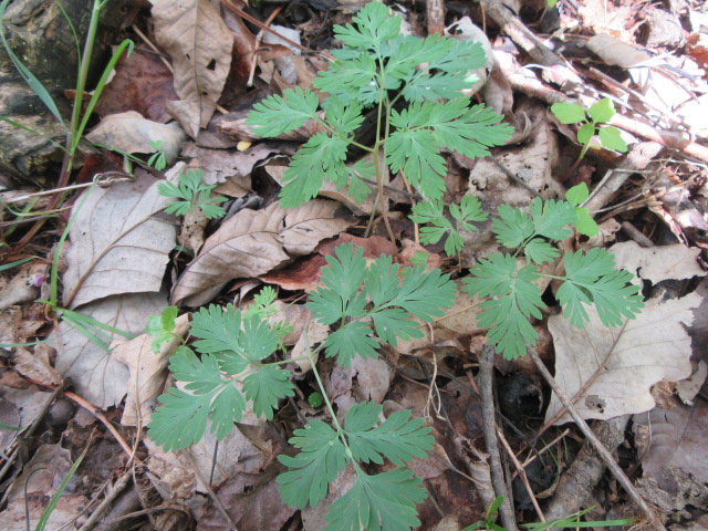 You know, there are MANY wildflowers with similar leaves or a portion of their leaves look like the leaves of other species. Huh? If you were an ordinary person walking in the woods for some reason in the spring, you may completely overlook this wildflower and think it was the same as a weed growing in a fence row or along the house. BUT, since you are reading this you are an extraordinary person and not ordinary at all. So, if YOU were walking in the woods in the spring you wouldn’t just be there for exercise. You would be looking for Morels and wildflowers. 🙂 If you spotted this clump of leaves you would notice right off it was somewhat different and perhaps you would think they resemble the leaves of your Bleeding Heart. I knew this plant was not an ordinary weed so I took a bunch of photos to get a proper ID. There are no flowers so I used the drag-and-drop upload gizmo on iNaturalist. Sure enough, it turns out to be Dicentra cucullaria also known as Dutchman’s Breeches, Butterfly Banners, Kitten Breeches and White Hearts. Missouri Plants says they flower from March through May so I have to keep an eye on this colony. I think this species goes dormant after flowering but I will have to refresh my memory… Bleeding Heart species have been moved around a bit depending on dormancy issues…