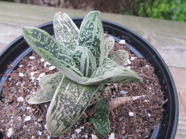 The Agave ‘Pineapple Express’, top photo, has been on the back porch this summer for a change. It changed colors in the sun, but it did very well and has grown to 10″ tall x 18″ wide. It is online as xMangave ‘Pineapple Express’, but as previously mentioned, xMangave is a synonym of Agave. I am curious, though, since Manfredia is now a synonym of Agave, does the patented name xMangave ‘Pineapple Express’ actually become Agave ‘Pineapple Express’? Hmmm…