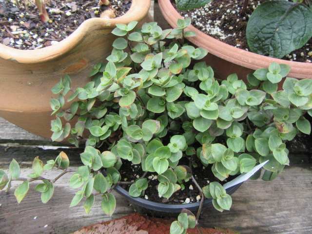 I have grown a Delosperma echinatum (Pickle Plant) for a few years but I haven’t had a good one… I must admit, this one has done much better despite its pot being invaded by its neighbor Callisia repens… The pot is half and half. I brought the pot inside and put it on the kitchen windowsill. We’ll see which one dies first. I haven’t been able to overwinter a Pickle Plant either… No page for this one.