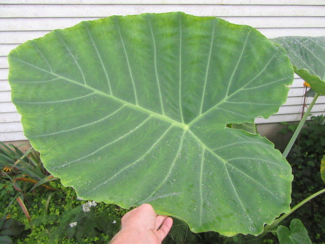 Leucocasia gigantea ‘Thailand Giant’ leaf at 36″ long x 32″ wide on 8-30-18.