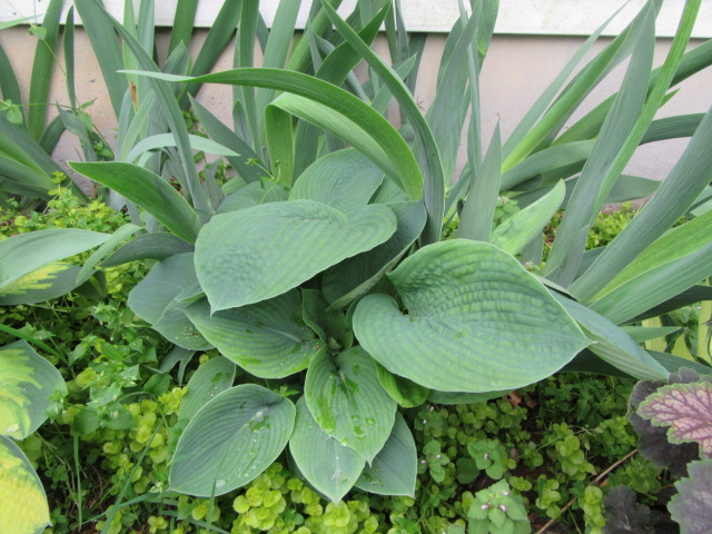 The leaves of the Hosta ‘Abiqua Drinking Gourd’ are very “puckered” and kind of cup-shaped. I haven’t seen any slugs for MANY years, but they are also snail resistant.