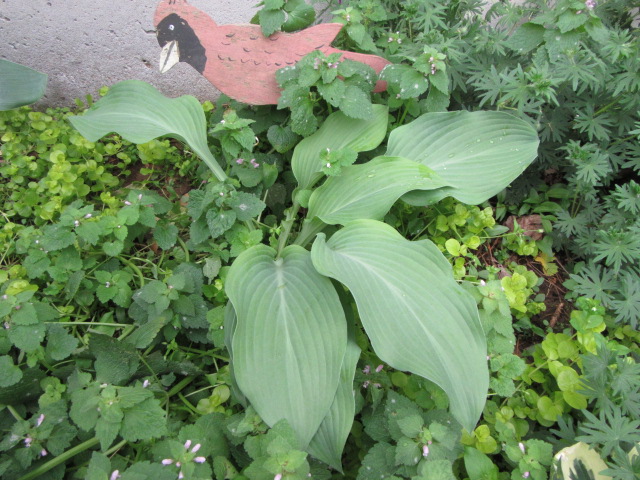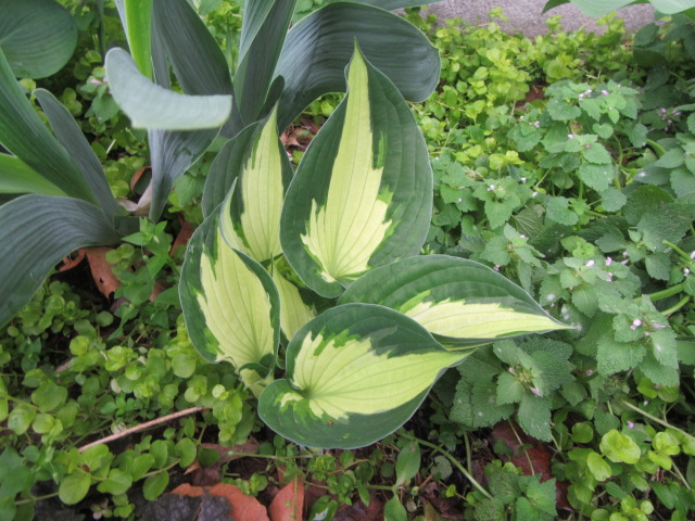 The Hosta ‘Patriot’ is a brightly colored plant nestled among the Geranium sanguineum (Bloody Cranesbill). Both have done quite well… I have noticed that, while not a large plant, ‘Patriot’ likes to spread out.
